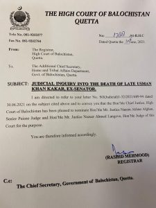 QUETTA: Chief Justice Balochistan High Court (BHC), Mr. Justice Jamal Khan Mandokhail has nominated two judges for the judicial commission to probe into the demise of Usman Khan Kakar, former senator.