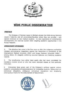 Bishkek — The Embassy of Pakistan in Bishkek has issued a warning to Pakistani students studying in Kyrgyzstan, particularly those pursuing medical education, urging them to exercise extreme caution when seeking admission to universities.