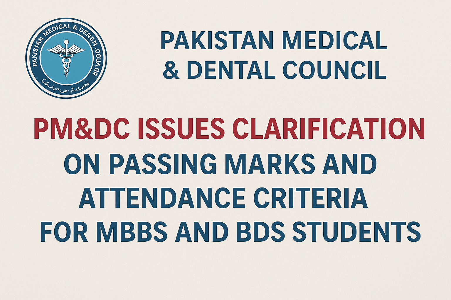 Islamabad — The Pakistan Medical and Dental Council (PM&DC) has issued an important clarification regarding minimum passing marks and attendance requirements for MBBS and BDS programs across medical and dental institutions in Pakistan.