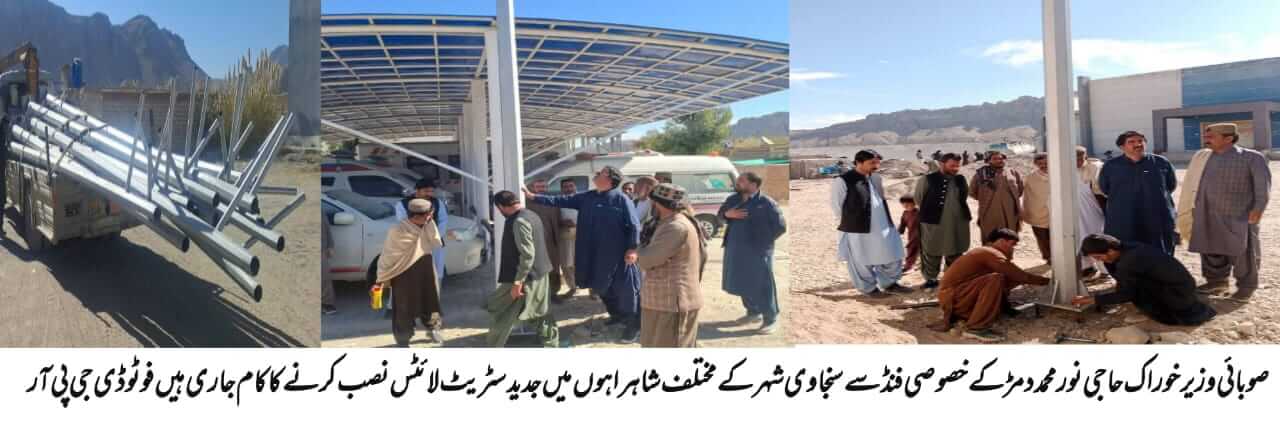 Sanjawi — Using the special development fund of Provincial Food Minister Haji Noor Muhammad Domar, and under the supervision of Chairman Municipal Committee Sanjawi, Haji Khan Muhammad Domar, the installation of modern streetlights has officially begun across various markets, roads, intersections, and streets of the city.