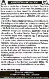 Quetta:The Balochistan Board of Intermediate and Secondary Education (BBISE) has issued an official public notice following directives from the Honorable High Court of Balochistan regarding the verification of Intermediate (HSSC) results from 2021 to 2025.