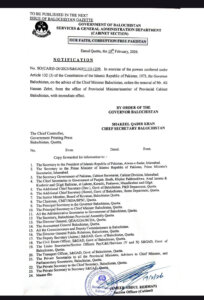 According to official sources, the move was made on the advice of the Chief Minister of Balochistan and subsequently endorsed by the Governor of Balochistan. After receiving the governor’s approval, the Chief Secretary issued a formal notification, giving immediate effect to the decision.