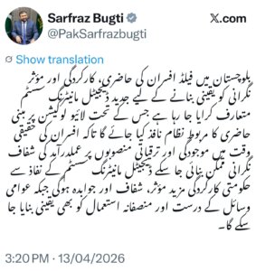 Web Desk: The Government of Balochistan has announced the launch of a cutting-edge digital monitoring system aimed at improving the attendance, performance, and accountability of field officers across the province. The new system will feature a live location-based attendance mechanism, allowing authorities to monitor officers in real time and ensure their presence at assigned duty stations.